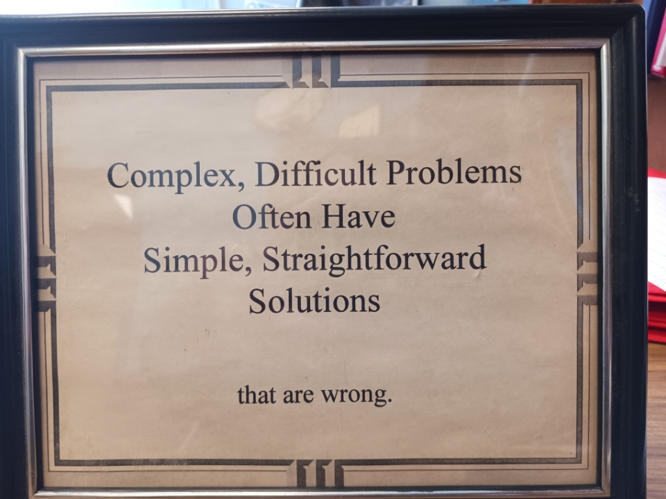 My brother has a sign hanging in his office.  It says, “Complex difficult problems often have simple straightforward solutions…that are wrong.”  Here’s a picture of the sign.